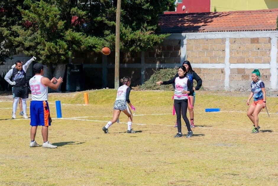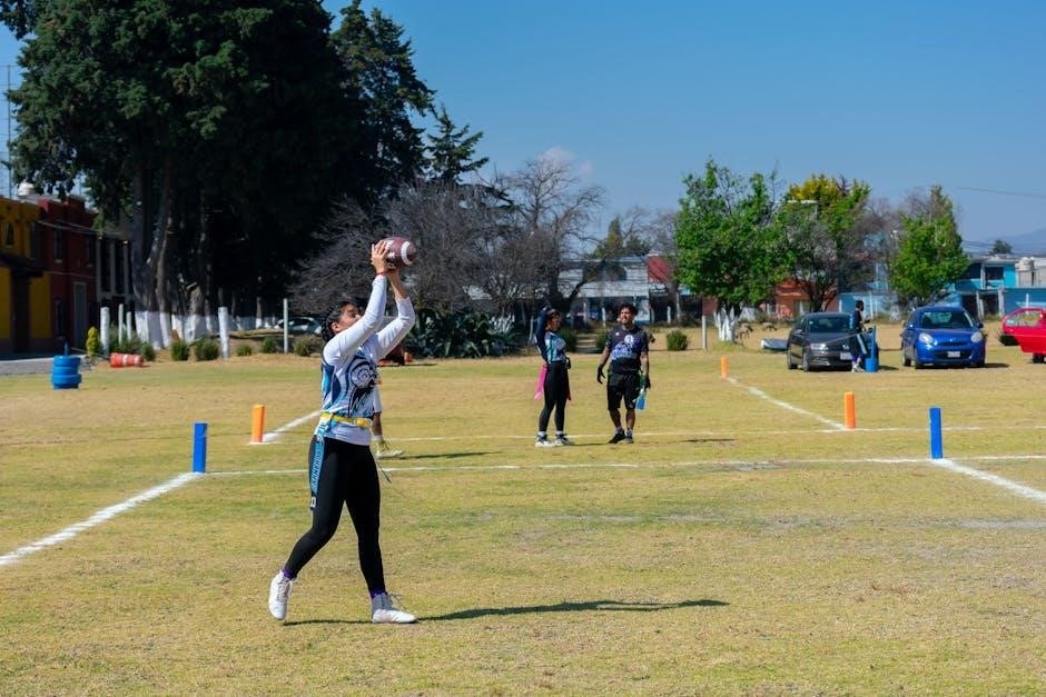 Many guides suggest using cones as targets, promoting consistent throwing form. NFL Flag PDFs often include partner drills, focusing on quick handoffs and accurate passes within a limited space. These drills build muscle memory and improve timing, crucial for efficient short-yardage plays.